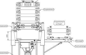 Die Last steht in Ruhestellung auf dem mechanisch gesicherten Hubturm, daher ist eine Zwischenlagerung der Last auf den Türmen ohne zusätzliche Sicherungen möglich
