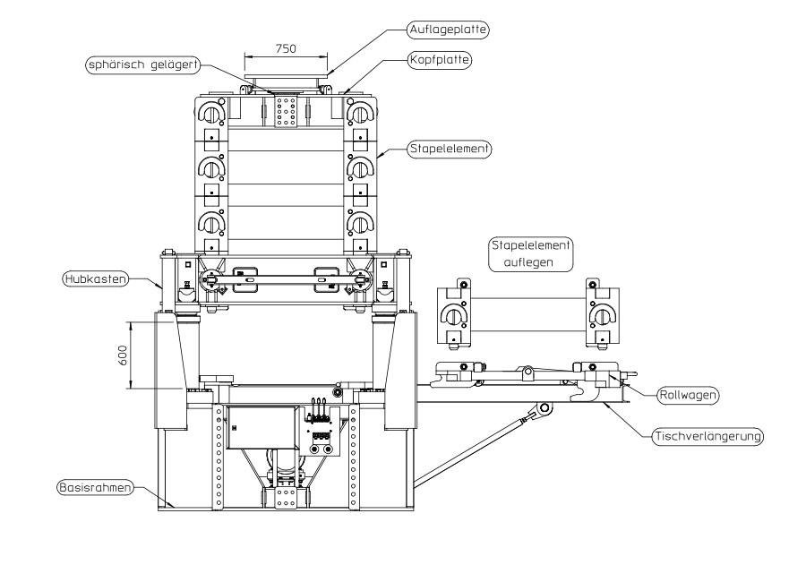 Für das gleichmäßige Anheben/Absenken des Systems sorgen redundante Positionssen-soren und für einen linearen Hub sind die quadratischen Auflageplaten (750mm) mit einer sphärischen Zentrallagerung versehen. Außerdem verfügen Basis- und Kopfplatten über zahlreiche Befestigungsmöglichkeiten für Zubehör oder die stabile Montage auf unseren SPMT-Modulen.